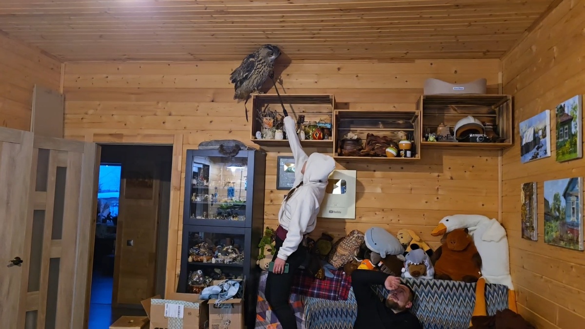 Сестра брата Егора начала тыкать сову Ёлку. Но она пошла дальше брата и тыкает сову не пальцем, а палкой.