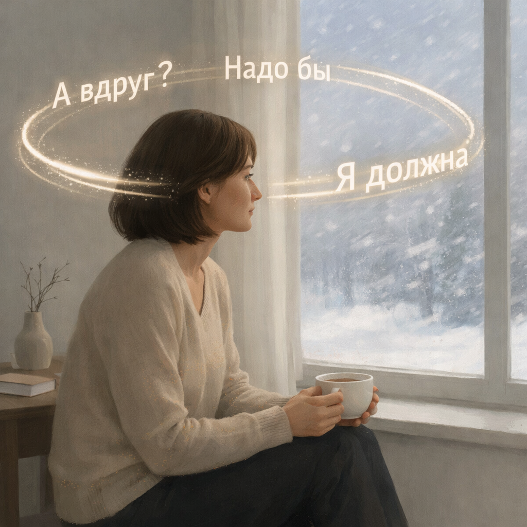 Мысли — «а вдруг», «надо бы», «я же должна» — поднимают вихрь, не давая перевести дух. Потом подступает досада: «Вот, опять. Все отдыхают, а у меня в голове карусель. Надо взять себя в руки!». И от этой мысли метель только усиливается. Круг замыкается. Беличье колесо, которое крутится на месте, сжигая драгоценные силы. И жаль не только энергии — жаль, что за праздничным светом снова подкралась эта знакомая усталость.