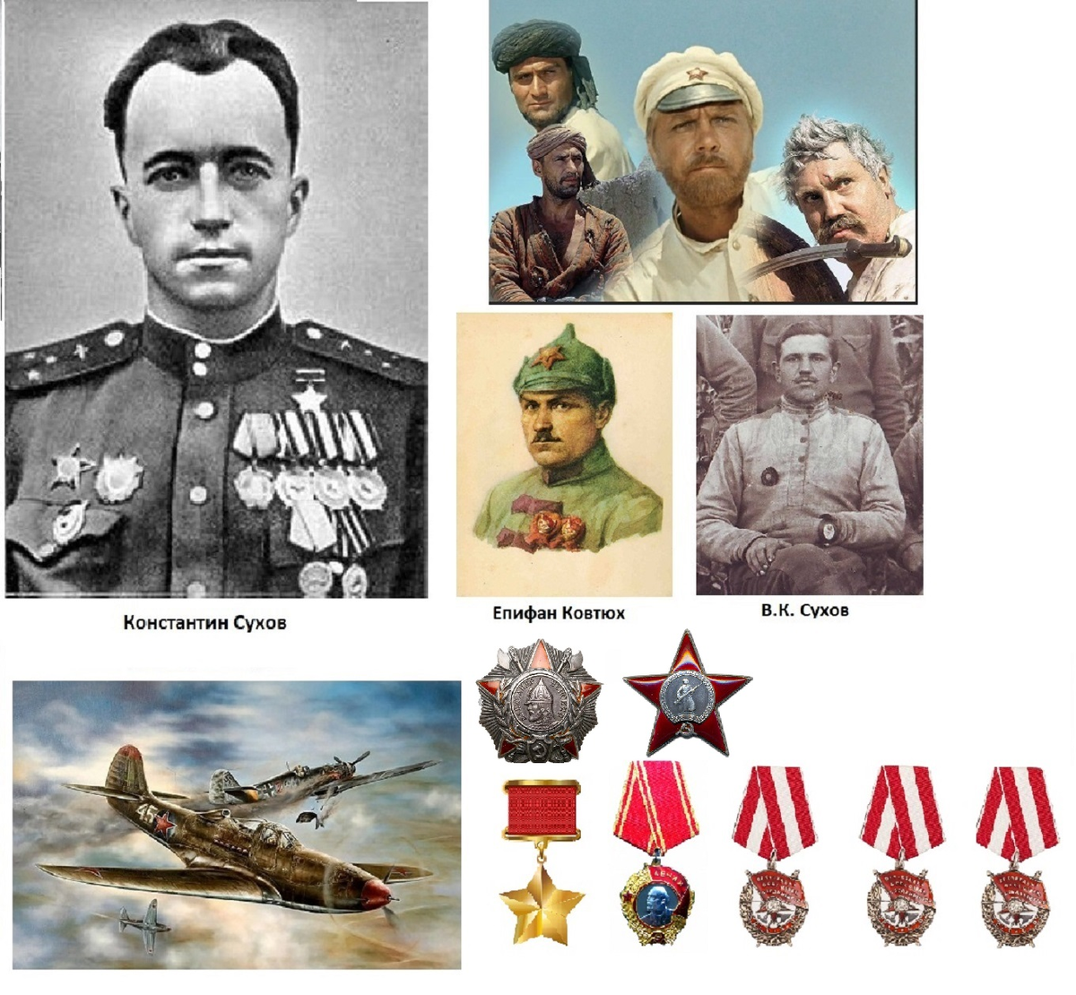 В той же 9-й гвардейской авиадивизии служит оружейником его отец, Василий Кузьмич Сухов, которого взял к себе под крыло Покрышкин по просьбе Кости. Василий Кузьмич имеет богатую биографию. Сам он кубанский казак, начинал военную службу еще при царе, после революции вступил в Красную армию, воевал с белыми на Таманском полуострове, стал порученцем у комкора Ковтюха, прошел с ним Тамань. После Тамани был Кавказ, а уж потом оказался красноармеец Сухов в Средней Азии, где дрался с басмачами и прошел через разные приключения, которых бы хватило, как он сам говорил, на захватывающий роман. Василий Кузьмич записывал свои воспоминания в толстую тетрадку, и в итоге, уже через много лет после окончания войны, попали они в нужные руки и послужили основой для сценария советского блокбастера «Белое солнце пустыни». Главному герою изменили имя, он стал Федором, но оставили настоящую фамилию. В сценарий попал даже именной пистолет Василия Сухова, полученный им от комкора Ковтюха за храбрость (в фильме комкора Ковтюха назвали комбригом Колуном). Костя в детстве не раз с восторгом рассматривал этот пистолет, слушая рассказ отца о том, как он, оказавшись в безвыходной ситуации, сумел перестрелять из него бандитов на берегу Каспийского моря.
