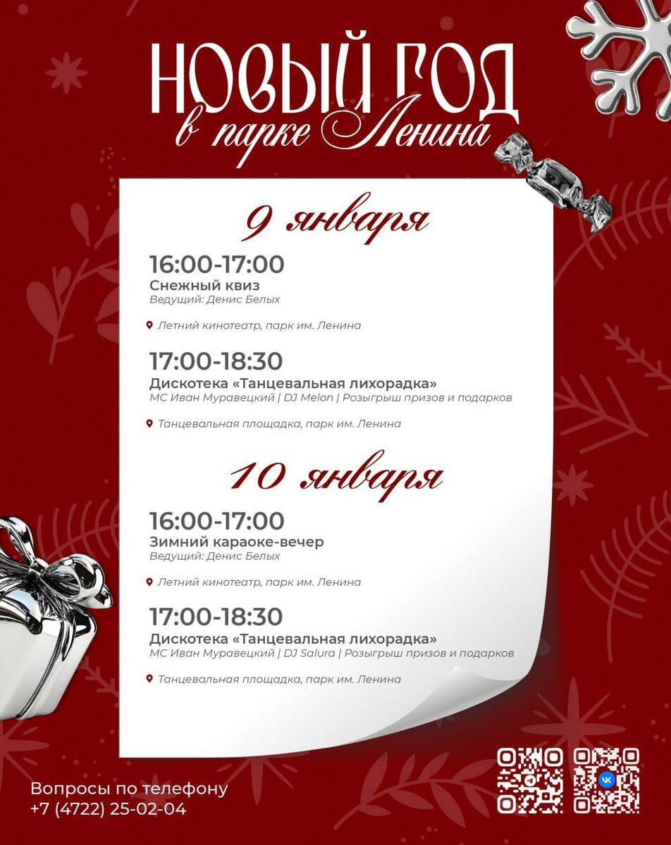 Культурный центр «Октябрь» приглашает жителей и гостей Белгорода провести 9 и 10 января в формате песен, плясок и интеллектуальных игр. 9 января в Центральном парке имени Ленина с 16:00 до 17:00 в летнем кинотеатре пройдёт «Снежный квиз». Для любителей песен в это же время и на том же месте, но уже 10 января пройдёт зимний караоке-вечер. 9 и 10 января на танцплощадке с 17:00 до 18:30 пройдут дискотеки «Танцевальная лихорадка», на которых гости мероприятий смогут потанцевать под треки МС Ивана Муравецкого, DJ Melon и DJ Salura. Также участников дискотеки ждёт розыгрыш призов и подарков. Подписаться на 🗞🗞 | Поддержать бустом