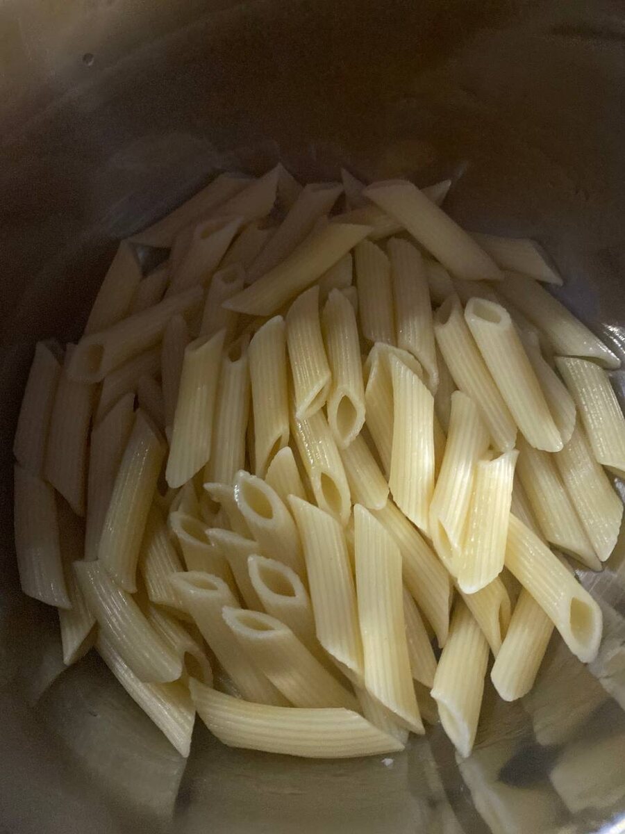 - Опустите пасту и варите до полуготовности (на 1–2 минуты меньше, чем указано на упаковке).
