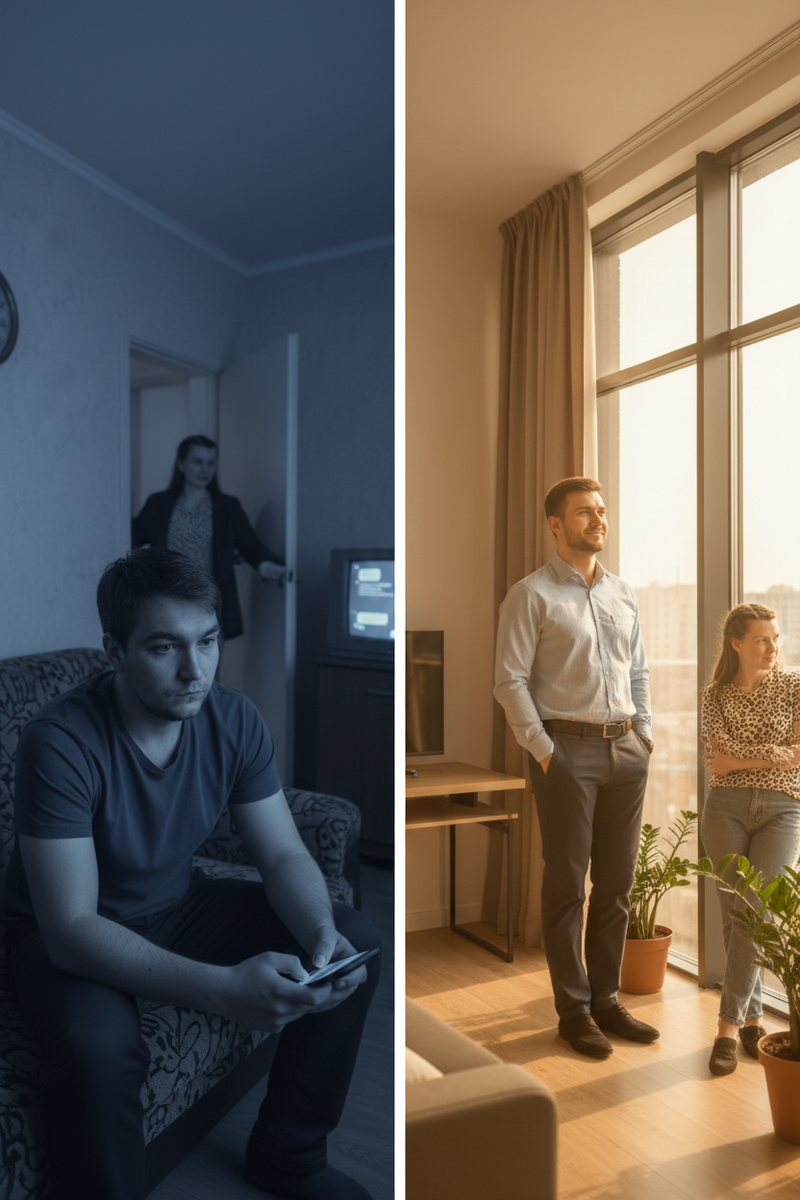 Заселился на следующий день. Привёз вещи, разложил по полкам. Сел на диван. Посмотрел вокруг. Голые стены, занавески серые, линолеум протёрт. Моя новая жизнь.