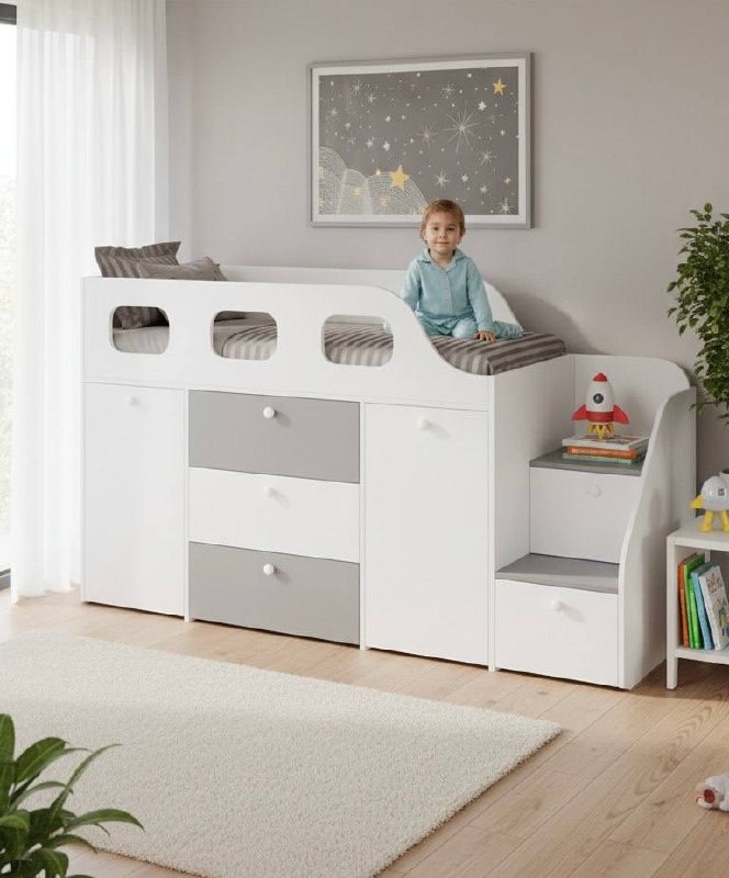 Детская комната — это вечный компромисс между игровой зоной, спальным местом и складом игрушек. Обычно родители пытаются втиснуть туда и шкаф, и комод, и кровать, в итоге места для жизни не остается. Сегодня разберем модель «чердака», которая решает проблему хранения раз и навсегда, и при этом не развалится через месяц активных игр. Главное опасение родителей: «А вдруг кровать хлипкая?». В этой модели основание спального места цельное и усиленное. Оно выдерживает нагрузку до 150 кг. Это значит, что мама или папа могут спокойно залезть к ребенку, чтобы почитать книгу или уложить его спать — конструкция стоит как вкопанная. Многие знакомы с проблемой, когда дно ящика прогибается и вылетает из пазов. Здесь об этом можно забыть: