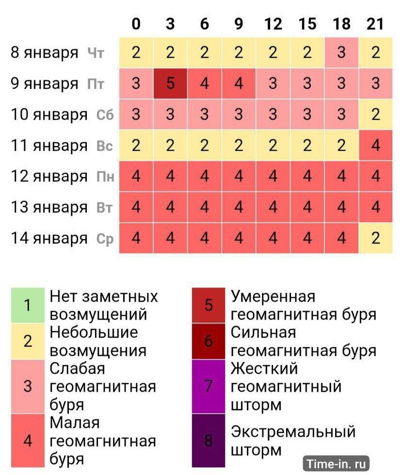 По данным сервиса Time-in, 11 января ожидается новое возмущение магнитного поля, которое будет достигать около 4 баллов.