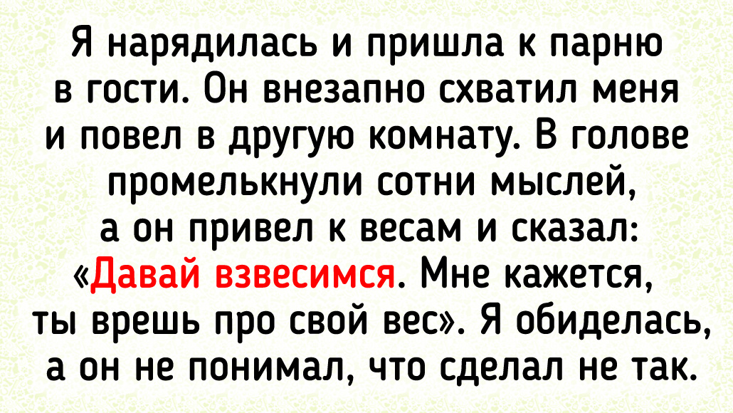 Я познакомилась с парнем через интернет. Он долго уговаривал меня на встречу, и в итоге я согласилась. Когда мы встретились, он оказался умным, привлекательным и с хорошим чувством юмора. Счет за ужин оплатил сам. В конце вечера он вдруг сказал: «Знаешь, зачем я зарегистрирован на сайте знакомств? Я учусь на режиссера и мне постоянно нужно находить людей для съемок. Но если бы я сразу рассказал о цели знакомства, мы бы не сидели здесь сейчас». До сих пор не понимаю, была ли это шутка, или он говорил всерьез, но видимо, «кинопробы» я не прошла.