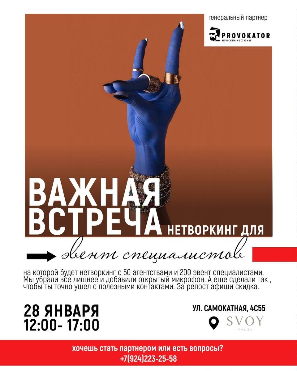 🔖 #28января2026 — клик на хештег, и видны все события дня #Москва #офлайн ⏰ 12:00-17:00 📍 SVOY LOFT ул. Самокатная, 4с55 💰 Стоимость от 2.000 руб до 10.000 руб ❗️ Регистрация Новый год - это год новый встреч и нетворкингов, поэтому вновь приглашаем вас на очередное мероприятие. 28 января «Важная Встреча», на которой будет нетворкинг с 50 агентствами и 200 event специалистами. Организаторы добавили открытый микрофон. А еще сделали так, чтобы ты точно ушел с полезными контактами. ⠀ Все будет проходить в SVOY LOFT на Яузе. ⠀ Можно будет рассказать о себе в формате открытого микрофона (2 минуты) ⠀ Билет сейчас можно купить за со скидкой по промокоду VSTRECHA ⠀ 📌 Добавить в Google Календарь Афиша профессиональных мероприятий для ивентеров МероПриятели! ВК https://clc.to/oiKisw Дзен https://clc.to/P6N_4A