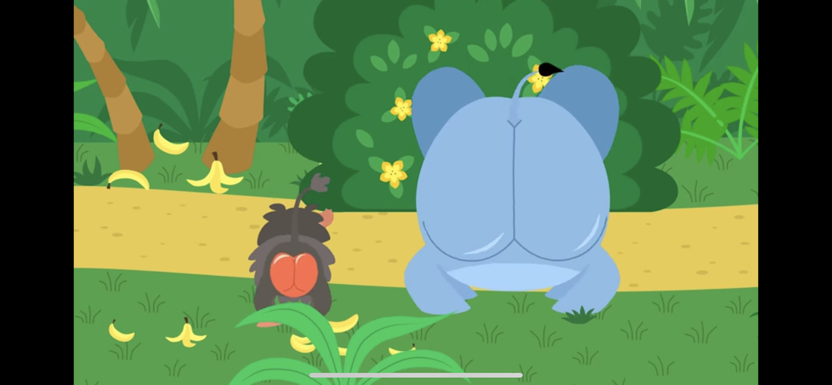 Павиан ходит по джунглям и вежливо, но настойчиво просит всех зверей... показать попу! Слона, крокодила, бегемота. Сравнивает, расстраивается, что у них попа «на них же похожа», а у него — нет. И в конце находит таких же, как он, павианов, и радуется, что их попы «на яблочки похожи».