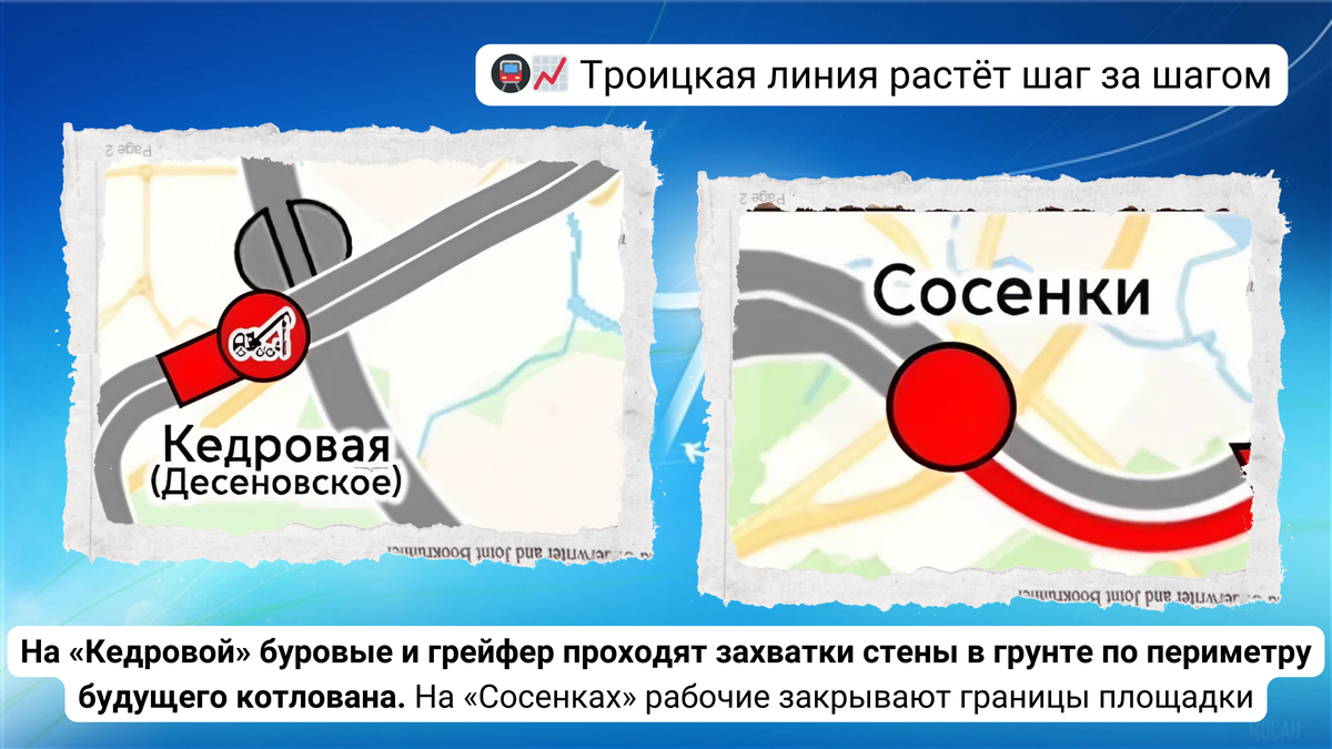 официальные отчеты. Давайте вместе разберемся, что же на самом деле происходит с нашей Москвой. Поехали? В первой части окинем взором площадку строительства 🚇 станции «Кедровая» 🏡 Троицкой линии с оборотными тупиками. Краткие итоги о ходе работ на площадке по состоянию на начало января: Во второй части окинем взором освоение площадки 🚇 «Сосенки» 🏡 Троицкой линии. Началось освоение западной части площадки на противоположной стороне улицы Старые Сосенки. Монтируется ограждение будущей стройплощадки, завозятся плиты. ------------------------------------------------------------------------------