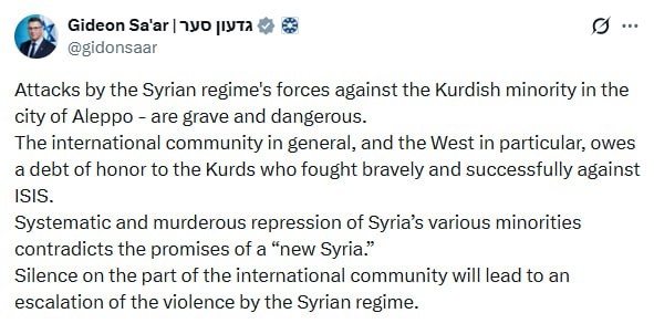 The world 'owes a debt of honor to the Kurds' for fight against ISIS — Israel FM slams Syrian gov amid clashes between SDF & authorities