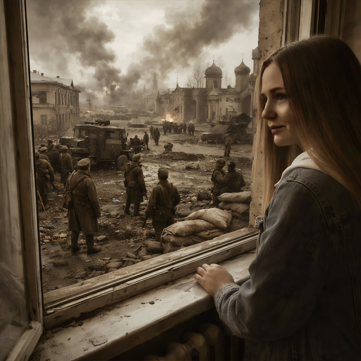 Россия времён Первой мировой жила ожиданием. Фронт был далеко, но его дыхание чувствовалось в каждом шаге. По дороге прошёл отряд солдат. Форма сидела неловко, винтовки казались слишком большими для их худых рук. Один из них, совсем мальчишка, оглянулся на дом и вдруг улыбнулся — быстро, неловко, будто вспомнил что-то мирное.