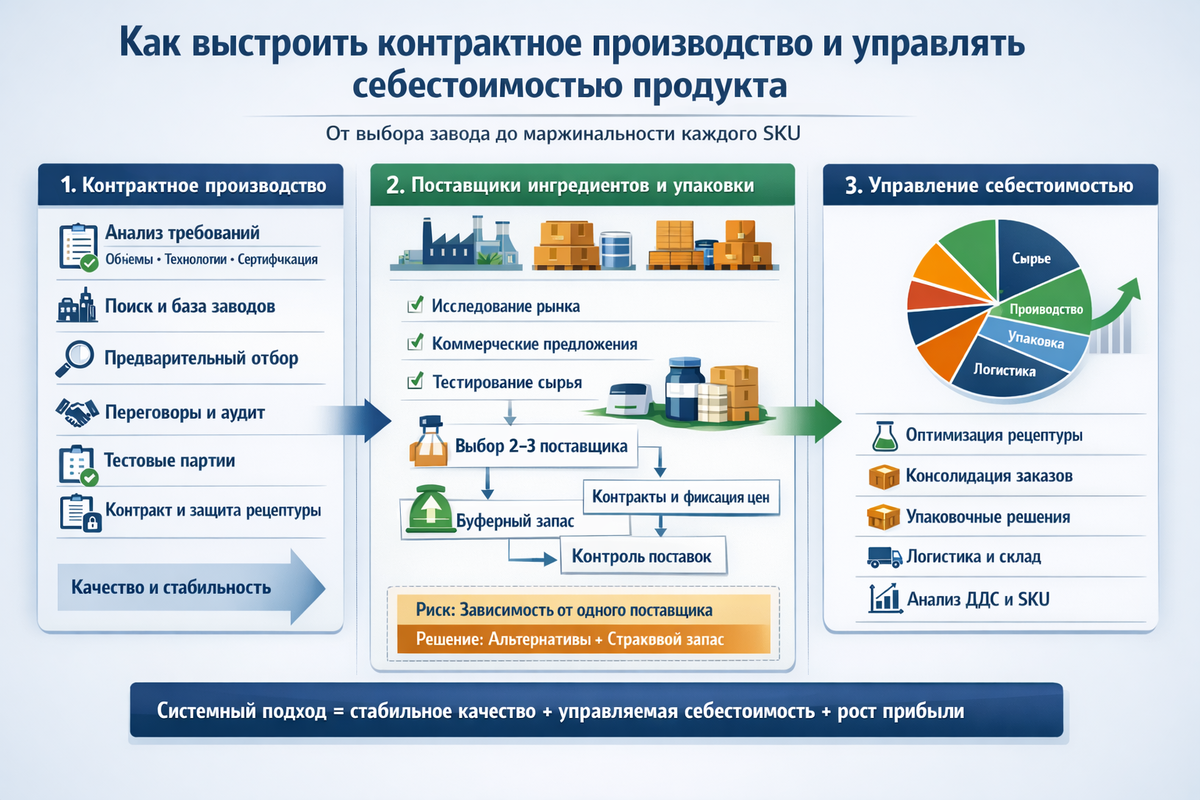 1. Поиск контрактного производства Поиск и выбор контрактного производства — ключевой этап для обеспечения стабильного выпуска продукции с требуемым качеством и оптимальными затратами. Основные шаги: 2. Работа с поставщиками ингредиентов и упаковки Выбор надежных поставщиков критически важен для обеспечения качества и конкурентной себестоимости. Ключевые этапы: Себестоимость напрямую влияет на маржинальность бизнеса, поэтому ее постоянный анализ и оптимизация являются приоритетом. Вывод Работа с контрактным производством и поставщиками должна быть направлена не только на обеспечение стабильного качества, но и на постоянное снижение себестоимости. Это достигается за счет грамотного выбора партнеров, оптимизации рецептуры, эффективных закупок и логистики, а также регулярного анализа финансовых показателей.