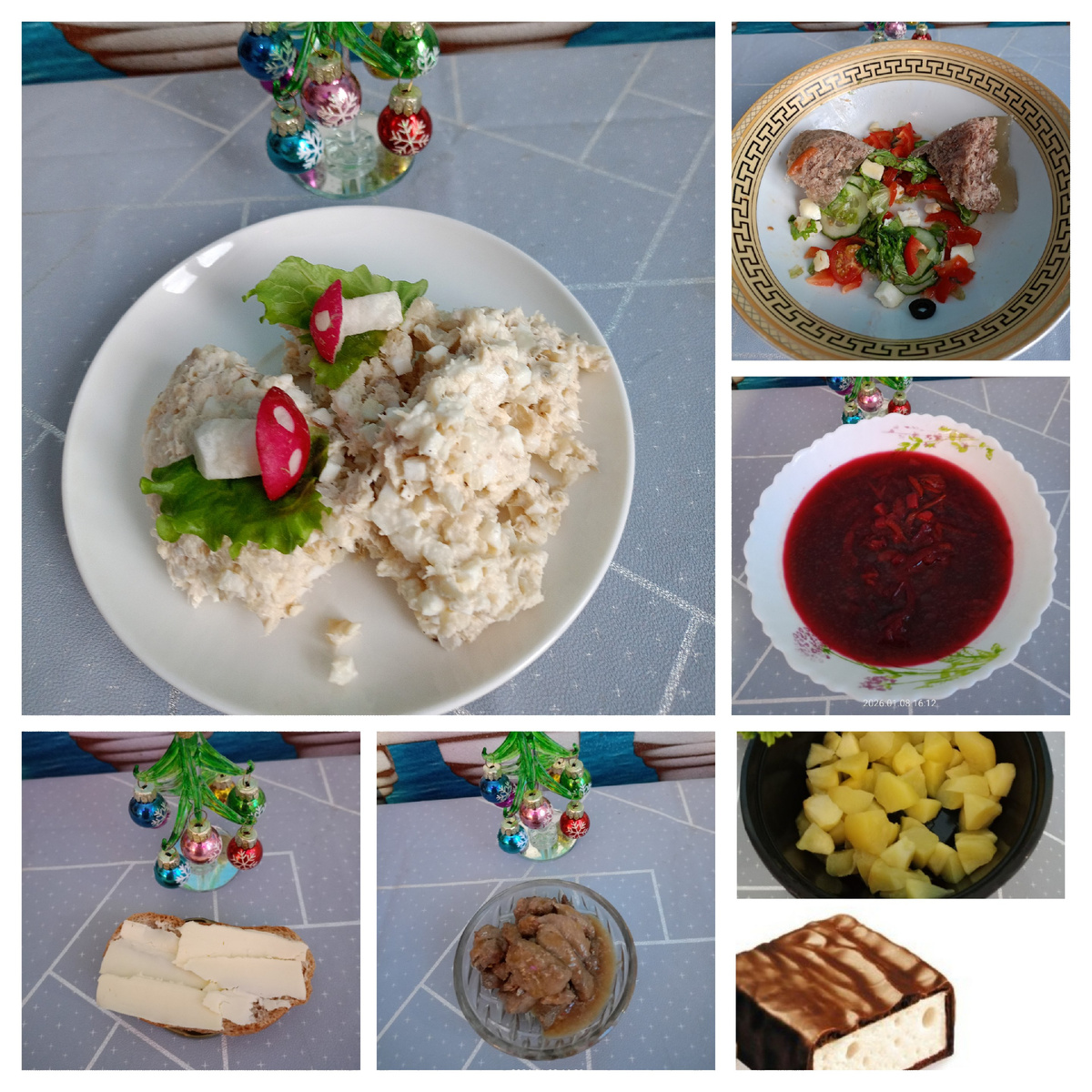 •Завтрак - свежие овощи; холодец из говядины; салат рыбный из минтая.