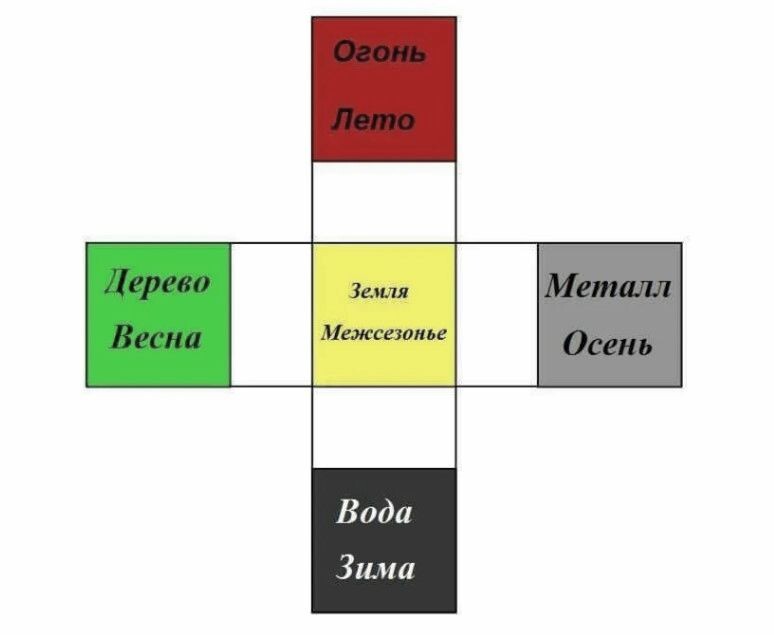 Всем известна диаграмма Пяти Первоэлементов У-Син в виде звезды. Однако, необходимо также иметь представление о том, что элемент Земля находится в центре системы - тогда пятиугольник превращается в крест: