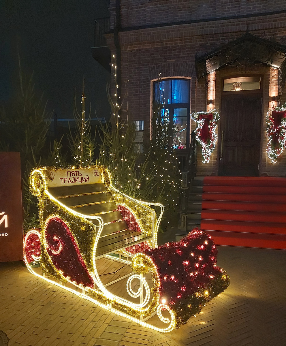 В прошлой статье мы прогулялись по праздничному парку Галицкого (ссылка на статью будет в конце), и увидели, сколько нового там появилось, а сегодня пройдемся по главной улице города, на которой вот уже второй год устанавливают украшения, посмотреть на которые приезжают со всей страны. И самое интересное, что оплачивает всю эту красоту не городская администрация, а местный человек-легенда Сергей Галицкий. Итак, начинаем нашу прогулку. Все заведения стараются привлечь внимание, украсить вход красиво и оригинально. Используют и световые фигуры и елки и гирлянды и символы наступившего года а кто-то оборудовал фотозоны Эта елка стоит на главной площади города но мне больше понравилась вот эта, очень красиво украшена! А вот и те самые украшения, разработку проекта и установку которых оплатил Галицкий. Эти фигуры меняют цвета и выглядят красиво и вечером и днем Световая арка тоже переливается разными цветами Светящиеся зеркальные "кувшинки" еще одна световая арка с "звездным небом" и еще одн