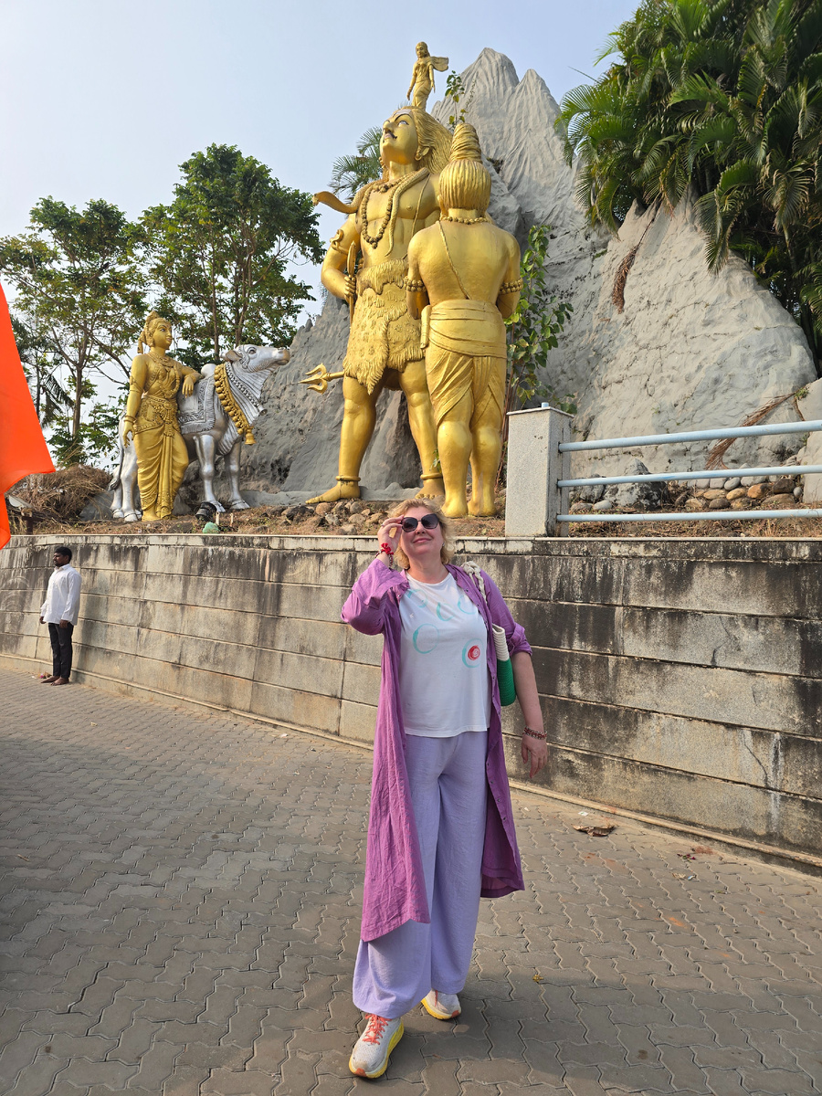 Коллеги, недавно вернулась из отпуска — на этот раз отдыхала в Индии, в Гоа и соседних уголках Карнатаки. Было столько впечатлений, что хочу с вами поделиться одним особенно сильным опытом. Одним из таких моментов стало посещение храма Шивы в Мурудешваре — место, которое не укладывается в одно определение. Оно одновременно масштабное, тихое, глубокое и живое. Мурудешвар — это небольшой прибрежный город в штате Карнатака, на берегу Аравийского моря, где стоит один из самых впечатляющих индуистских храмов в Индии. Это не просто туристическая точка. Комплекс известен огромной статуей Господа Шивы, высотой около 123 футов (≈37 м) — одной из высочайших статуй Шивы в мире, и которую видно за долго до подхода к храму. Рядом возвышается впечатляющий Raja Gopuram — 20-этажная гопура (врата), откуда открываются панорамные виды на море, храм и побережье. Это не место «за кадрами» и «за галочками». Здесь часто надолго замирают в тишине, многие медитируют, сидят без слов, просто вбирая пространст