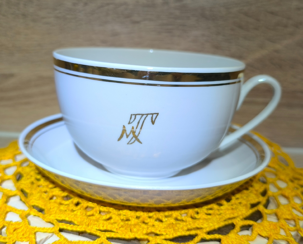 Рада приветствовать, Вас на моем канале. Хочу сегодня поделиться с Вами приобретенным ещё с того года новым предметом, долго не думала о покупке, увидела решила купить. Чайная пара - гигант с аббревиатурой букв «МТ» (печатные), что "министерство торговли". Производство знаменитого Дмитровского фарфорового завода, клеймо с "головой лося" из советского периода. Чашка с двойной золотой обводкой, приземистой формы. Легкая, но не прозрачная, удобная. Блюдце также с двойной золотой обводкой. Позолота на чайной паре сохранилась идеально. У меня в пару к ней есть пиала, также золотой обводкой буквами «МТ». Но, лучше смотрится в компании с белыми чайными парами от ЮФЗ, по форме одинаковые только объём разный. Также им вторят тарелочки с золотой каёмочкой и аббревиатурой «МТ», от Дулевского фарфорового завода и ФЗ "Пролетарий». Получилась небольшая подборка по стилю, посмотрим куда это можно будет пристроить со временем. Приятного пить ароматный чай из новой кружки - гиганта, особен