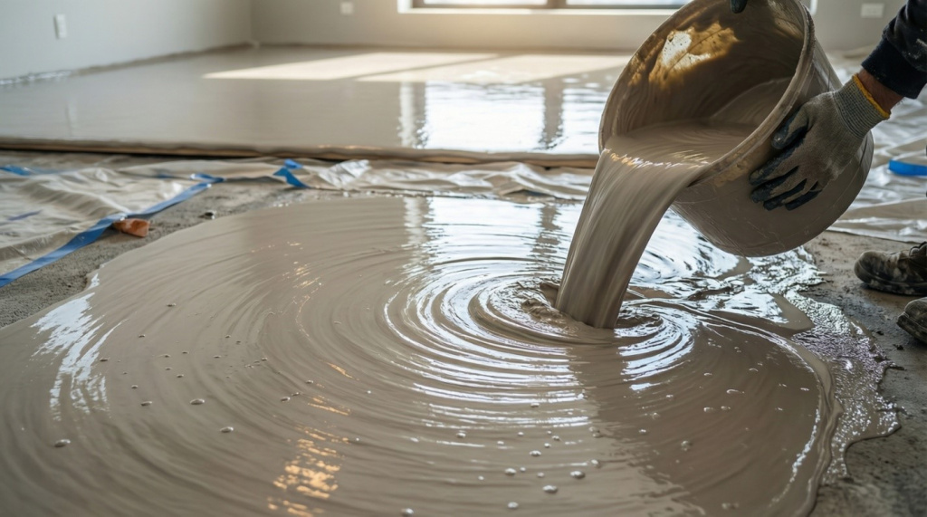 - Вы заливаете самонивелирующуюся смесь (наливной пол), которая по консистенции напоминает жидкую сметану.