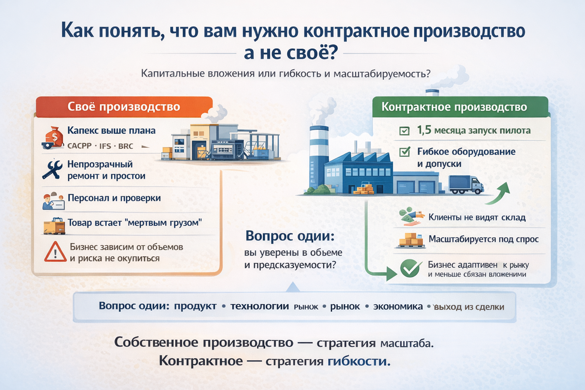 И почти всегда за этим стоит не расчёт, а страх — зависеть от кого-то ещё. Контрактное производство — это не компромисс и не временная мера. Это инструмент. Но только если понимать, когда он оправдан, а когда действительно пора строить своё. Собственное производство воспринимается как контроль и безопасность. На деле — это капитальные затраты, персонал, простои, ремонты, проверки и управленческая нагрузка.
