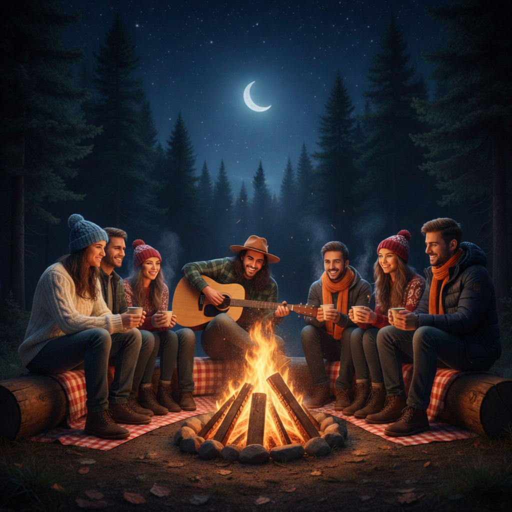 Один из друзей взял гитару и сыграл простой, спокойный мотив. Никто не спешил. Другой налил кофе из термоса. Аромат кофе смешался с дымом и сделал атмосферу ещё уютнее.