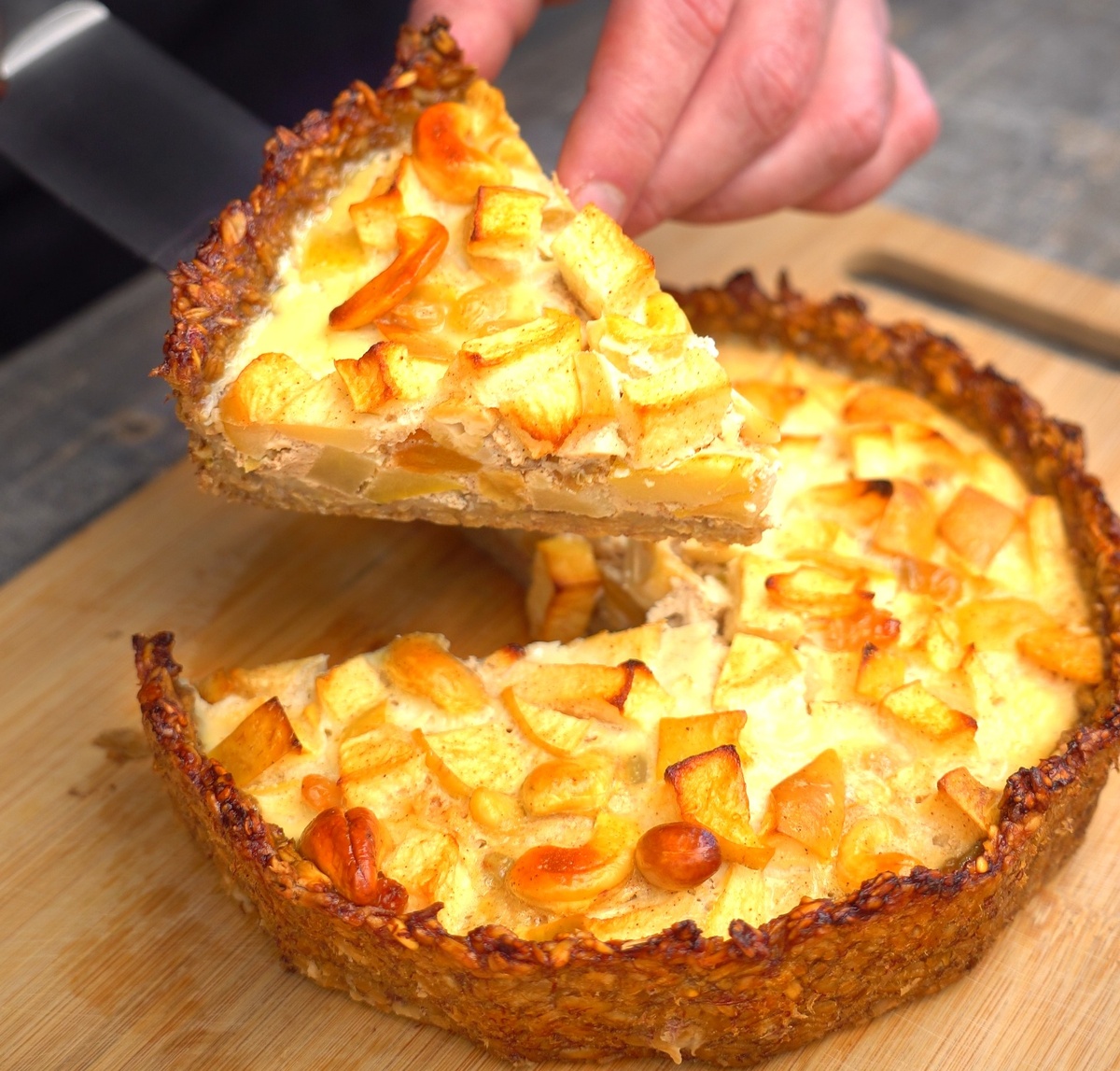 Я часто готовлю его утром или накануне вечером — он отлично подходит и к завтраку, и к чаю днём. Бананы дают естественную сладость, яблоки — сочность и лёгкую кислинку, а овсяные хлопья делают текстуру плотной и сытной. Пирог не перегружает, но хорошо насыщает, поэтому его спокойно можно есть без чувства вины. Готовится он просто, без миксера и сложных этапов — всё делаю в одной миске и обычной форме для выпечки. Основа: Начинка: Сначала я занимаюсь основой. Бананы очищаю и разминаю вилкой до состояния однородного пюре. Чем спелее бананы, тем ароматнее и слаще будет пирог. К банановому пюре добавляю овсяные хлопья и хорошо перемешиваю — масса должна получиться густой и слегка липкой. Форму для выпечки смазываю небольшим количеством сливочного масла. Затем выкладываю овсяно-банановую смесь и распределяю её по дну и бортикам, слегка прижимая ложкой или руками. Основа получается плотной и хорошо держит форму. Дальше готовлю начинку. Яблоки нарезаю небольшими кусочками, кожуру не снимаю —