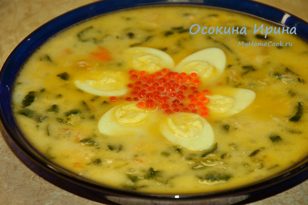 На хвостике форели сварила бульон, рыбку достала, сняла мякоть с костей и разобрала на кусочки, а бульон процедила. В другой кастрюле на топлёном сливочном масле обжарила 1 рубленную луковицу и 1 маленькую резаную морковку, влила бульон, довела до кипения, вернула рыбку, посолила, поперчила, добавила 100 г резаного свежего шпината, варила всё вместе пару минут, добавила 100 г плавленого сыра их ванночки, промешала до его растворения, накрыла кастрюлю крышкой, сняла с огня, немного настояла и подала, сервируя каждую тарелку половинку отварных перепелиных яиц и красной икрой. Супчик получился просто гурманский) Приятного аппетита