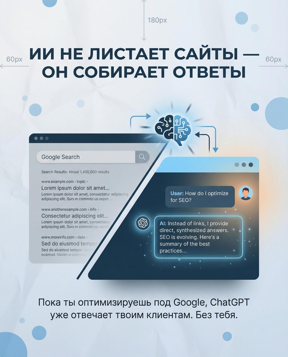 ) Вот тут 👉 https://app.chatplace.io/virale/ Ну что могу сказать — не дурно, но дизайн не самый стилёвый. По ощущениям у них такой процесс внутри: скорее всего связка LLM (что-то уровня Gemini) + условная Nana Banana Pro для визуала. Плюс, возможно, есть ещё отдельная нейронка на анализ контента и тд. Отдельно тестила на теме "GEO против SEO" 👇 О том что ИИ не листает сайты — он собирает ответы. GEO — это оптимизация под генеративные системы, где важны структура, семантика и внешние источники доверия, а не просто позиции в поиске. ⚠️ Но вернемся к каруселям, лично я использовать Chatplace не буду — потому что в мой стиль он совсем не попадает. В таких случаях мне проще попросить Draft — он, кстати, ещё и дешевле (около 1500). Но у Chatplace очень много других задач и возможностей, не только карусели. Самое приятное — легких агентов добавлять супер просто и удобно. Но и сделать их самим как правило несложно)))