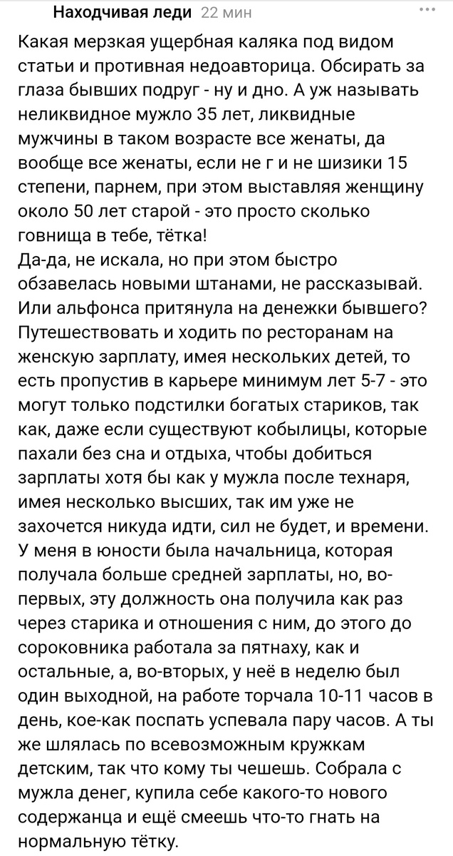 А если статью прочитают десятки тысяч человек, то и завистниц будет гораздо больше, и злобных комментариев тоже.