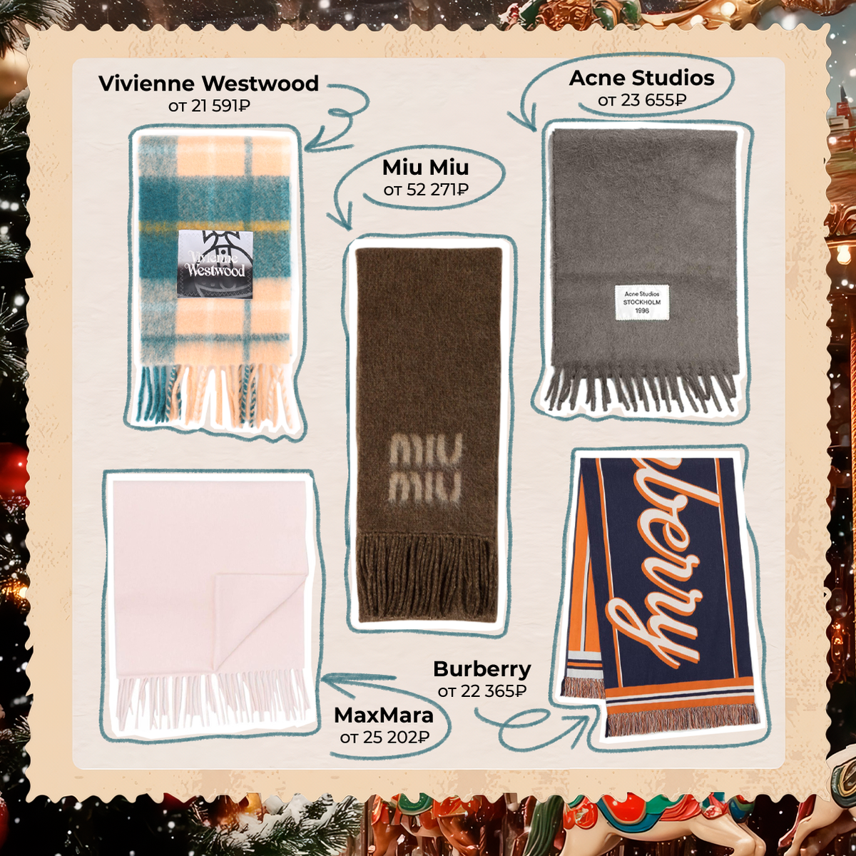 Мало того, что этот аксессуар добавляет тепла, так он еще и очень стильно смотрится. С айтемами из нашей подборки аутфиты точно заиграют новыми красками. Vivienne Westwood, цена от 21 591₽* Burberry, цена от 22 365₽* MaxMara, цена от 25 202₽* Acne Studios, цена от 23 655₽* Miu Miu, цена от 52 271₽* *стоимость может изменяться в зависимости от курса и размера Больше интересного на нашем сайте POIZON