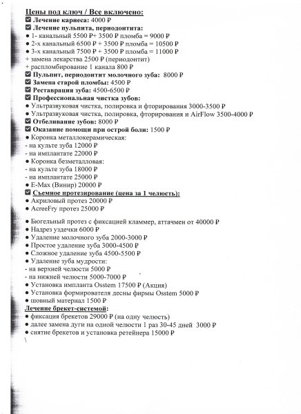 Семейная стоматология Медента 8-800-555-73-67 Бесплатная консультация Всех специалистов и КТ в подарок Белорецк Ленина 57, Учалы Горького 4 Прайс лист (фото) под ключ : Акция* Ультразвуковая чистка + полировка за 2490 Акция* Ультразвуковая чистка + полировка + фторирования + АirFlow за 3490 Лечение кариеса 3500-4000 Металлокерамическая коронка 10000 Коронка циркон,eMax 15000 Зубные протезы (Бюгельный, Акриловый, АкриФри) от 15000 Акция* Установка Импланта (Osstem) 17500 Акция* Установка брекет-системы 29000 vk.com/stomatologiya_belore… стоматологиябелорецк.рф Рассрочка без участия банка на 12 месяцев Работаем с 9 до 21:00, 7 дней в неделю Есть противопоказания. Необходима консультация специалиста. Запись для лиц старше 18 лет Источник https://uchaly102.ru/?p=118849