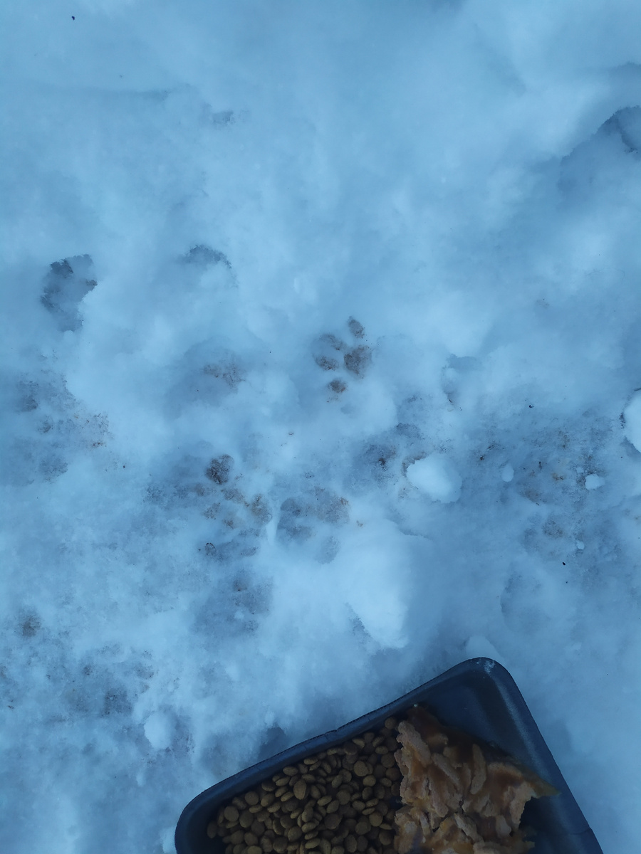 Заявила я ребёнку. Потом уже поскребла по сусекам нашла остатки корма с котолета и мы с Михаилом (куда ж без него) пошли. А мороз у нас хороший, -11 ощущается как -18... У автобуса уже протоптана хорошая такая тропинка, на которой не маленькие кошачьи следы. Поставили рядом подложку с кормом и стали ждать. Я вообще не знаю зачем, не спрашивайте... Может потому что кот производил впечатление жутко напуганого и голодного, может просто по привычке старые времена вспомнили. Ждали не долго, не думали вообще. Большого кота не дождались. Так получилось... Знакомьтесь. Это Микрик.