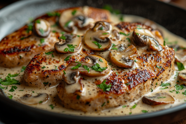 Это блюдо – воплощение зимних кулинарных традиций, где сочная свинина, как ночное полотно, укрыта мягким "небом" из сливочного соуса с грибами. Насыщенный аромат томленых грибов, переплетающийся со сладостью лука в густых сливках, создает поистине благородное,