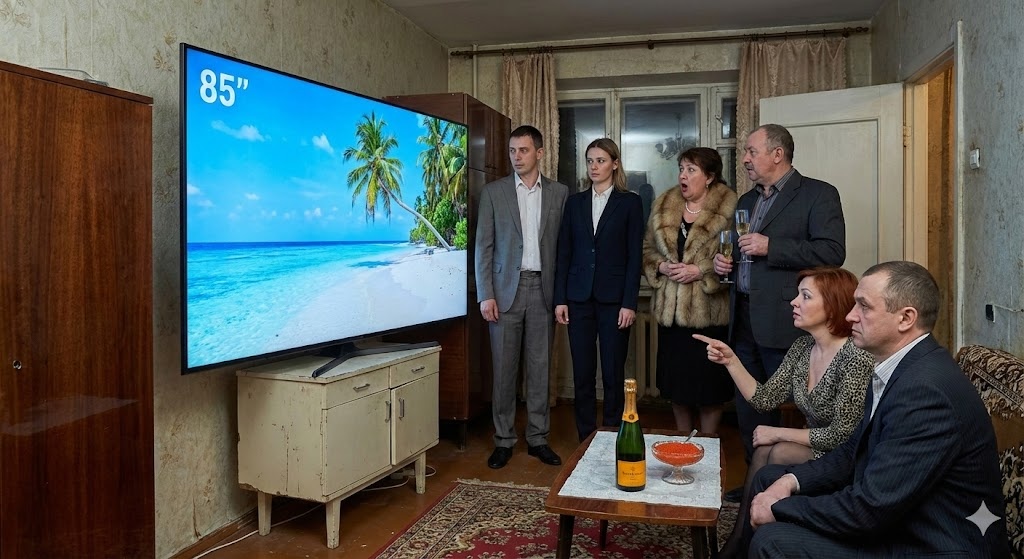 Экран вспыхнул. 85 дюймов. Картинка была настолько четкой, что казалось, можно шагнуть внутрь и оказаться на Мальдивах, которые крутили в демо-ролике. Телевизор занял полстены, затмив собой старый сервант и наши свадебные фото. Он кричал о богатстве. Он вопил о статусе.