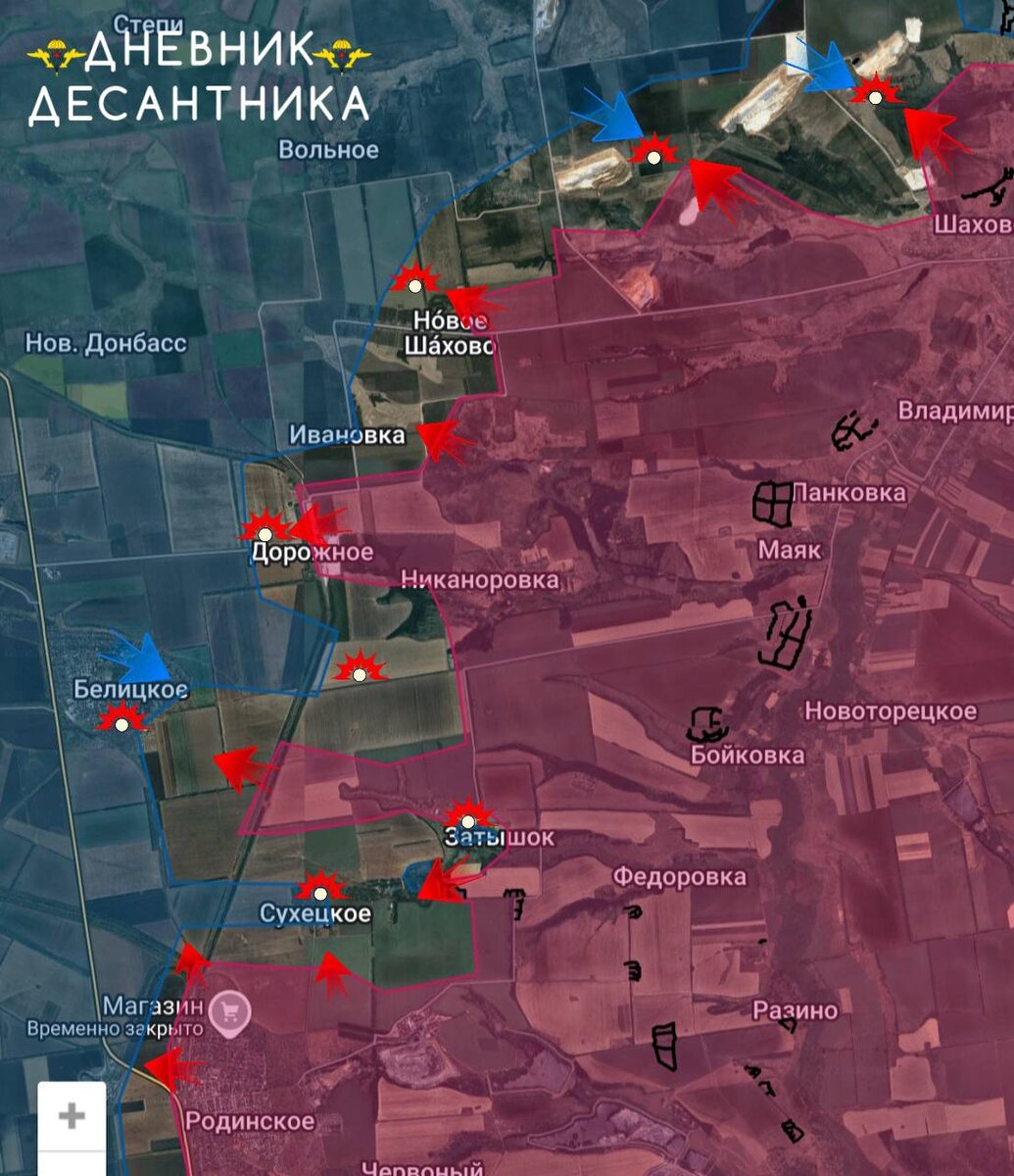 ▫️На западной части выступа идёт зачистка Родинского и бои за Белицкое. ▫️В Суворово (Затышок) бои сместились к центру, наши войска взяли под контроль восточную часть села и территории южнее, включая два крупный укрепленных опорных пункта. ▫️Большая часть Сухецкого находится в серой зоне. ▫️На северной окраине выступа у Октябрьского (Шахово) без особых изменений по линии фронта. ▫️ Дневник Десантника 📲 Дневник Десантника в МАХ