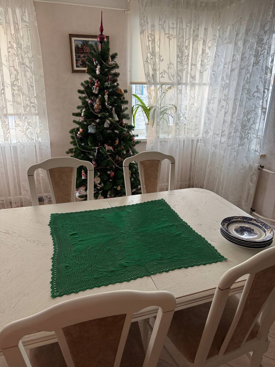Изначальная задумка была купить 2 мотка Анны 16 и связать 2 небольшие салфетки на стол, что-то пошло не так 😁 и салфетка получилась одна и размером с мини-скатерть около 70 на 70 см. И всего 7-10 дней в году она будет нас радовать, в остальное время стол занят компьютером 😔 С блокировкой я еще не подружилась, поэтому края кривые, и еще надо приобрести какой-нибудь коврик для блокировки, она не поместилась на мой из Ленты 😅