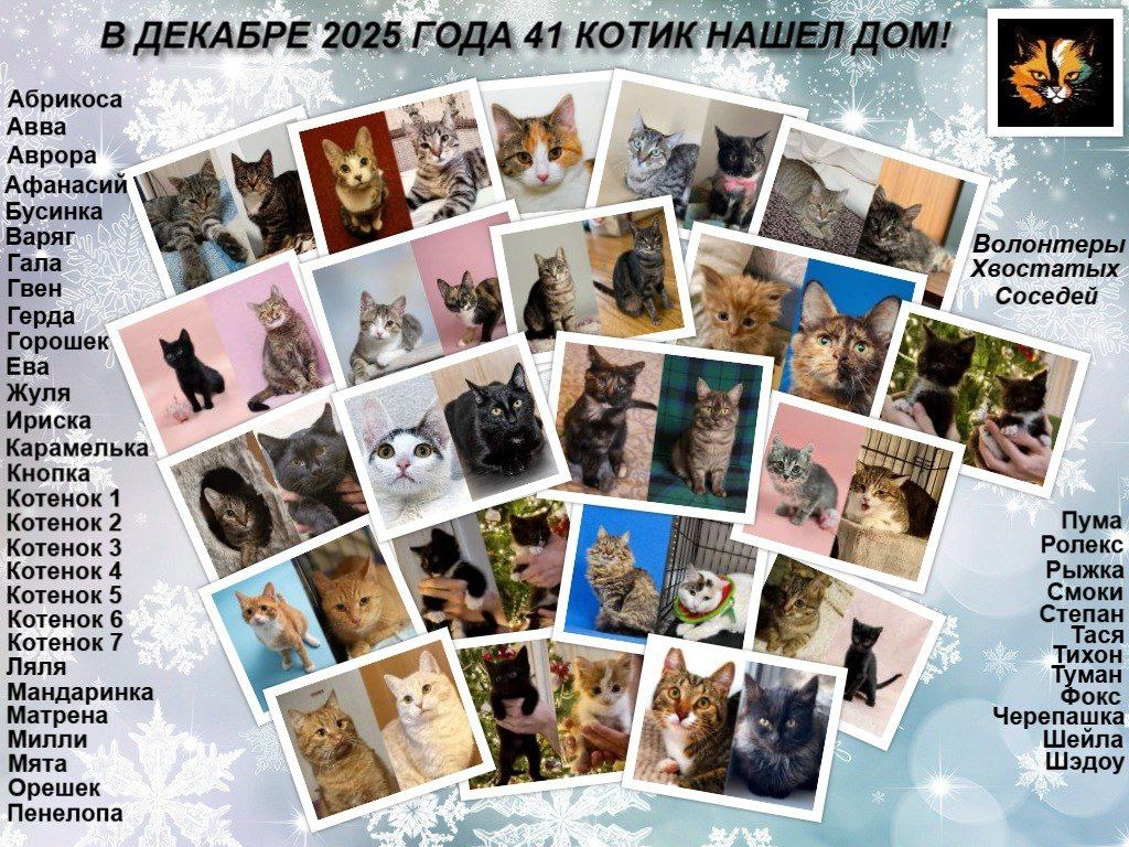 !? А у нас сегодня, 1 января 2026 года традиционный отчет о проделанной работе. 41 хвост нашел свой теплый дом в декабре! 41 шерстяное пузико будет наглажено в своей лежанке... 41 сердечко будет биться для своей семьи... Что особенно радует и чем гордится наша команда пиара, что уехала девочка с атаксией, Пенелопа. Спасибо семье до неба за нее... Еще в 2025 уехали пять котиков с лейкозом...все мы знаем, что это тяжёлое заболевание...люди бояться брать таких бедось...и они вынуждены ждать свои семьи годами... Рыжик ВИК ВЛК Дома 2025 Беззубик (Рыжик) ВЛК Дома 2025 Ангел ВЛК Дома 2025 Муза ВЛК Дома 2025 КузОтис ВИК Дома 2025 Спасибо вам всем...это все благодаря вам...