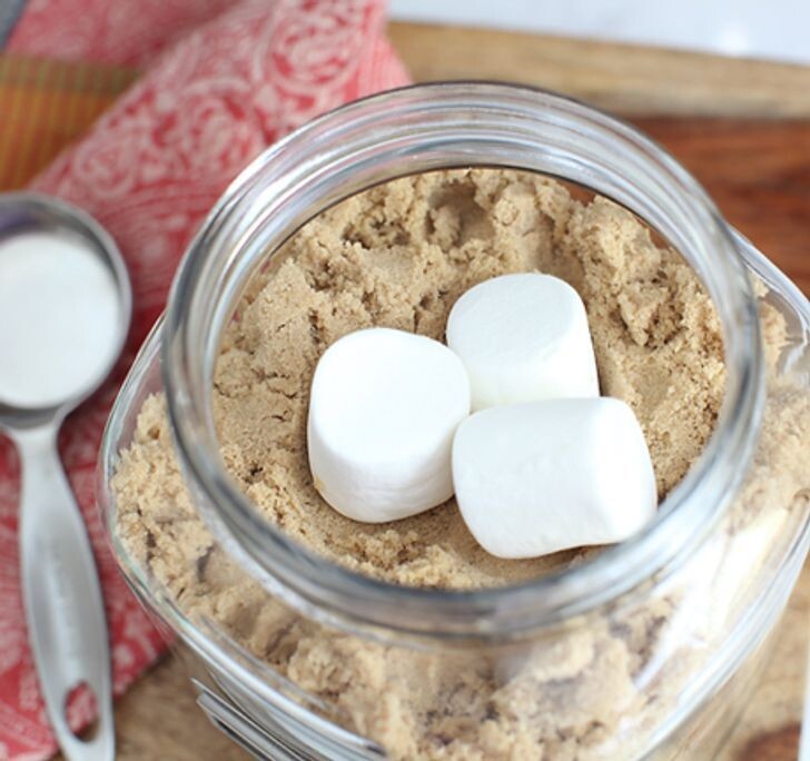 Сахар твердеет, потому что из него уходит влага. Чтобы он всегда был рассыпчатым, нужно просто положить в банку «соседку», которая будет отдавать эту влагу по чуть-чуть. Я кладу обычную зефирку (маршмэллоу) или чистую корочку от апельсина. Маршмэллоу со временем засыхает сама, зато сахар остается мягким и идеальным. А от апельсиновой корки сахар еще и приобретает едва уловимый, очень приятный аромат. Маленькая деталь, а жизнь на кухне становится проще!