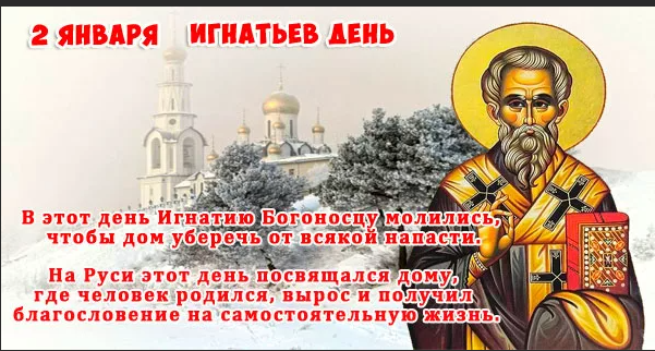 2 января православные верующие чтят память святого Игнатия Богоносца — ученика апостола Иоанна Богослова и одного из первых христианских мучеников. Этот день совпадает с началом предпразднства Рождества Христова и в народе известен как Игнатьев день. Считалось, что молитвы святому оберегают жилище от бед, а соблюдение традиций сулит счастье на весь год. На Руси Игнатьев день посвящали родному дому — месту, где человек вырос и получил благословение на жизнь. В этот день было принято служить молебны святому Игнатию, прося его защитить жилище от пожаров, воров и несчастий. В некоторых селах совершали крестный ход с иконой вокруг деревни. Игнатьев день был наполнен строгими запретами, нарушение которых, по поверьям, грозило бедами и нуждой. По погоде 2 января судили о том, каким будет август. Наши предки говорили, что человек, рожденный в Игнатьев день, будет очень привязан к дому и своей семье. Сегодня всем полагалось уделить больше времени родителям и дому, где выросли. В старин