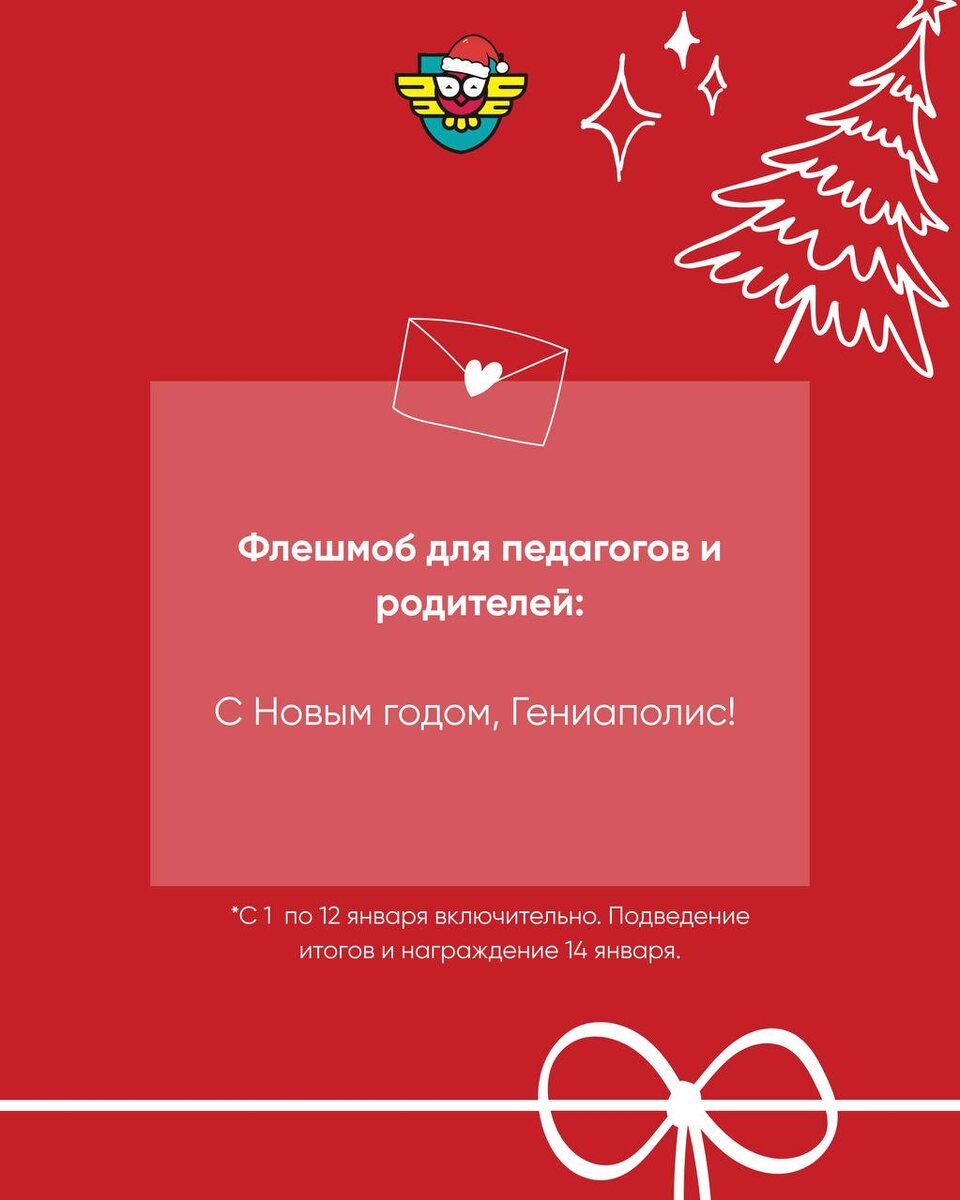 ФЛЕШМОБ ДЛЯ РОДИТЕЛЕЙ И ПЕДАГОГОВ «С НОВЫМ ГОДОМ ГЕНИАПОЛИС»🦉🎄 Сегодня мы запускаем новогодний флешмоб и приглашаем родителей и педагогов стать частью нашей общей праздничной истории ✨ Как принять участие: 1. Запишите видео или сделайте фото с новогодним поздравлением. 2. Поставьте хэштэг #СНовымГодомГениаполис. 3. Опубликуйте ваше поздравление в своих социальных сетях. 4. Отправьте ссылку на вашу публикацию в комментариях к этому посту. https://vk.ru/wall-178845156_1307 📅 Сроки флешмоба: с 1 января по 12 января включительно Подведение итогов и награждение участников — 14 января. Давайте вместе создадим тёплую, искреннюю и по-настоящему живую новогоднюю открытку для нашего любимого Гениаполиса ❤️