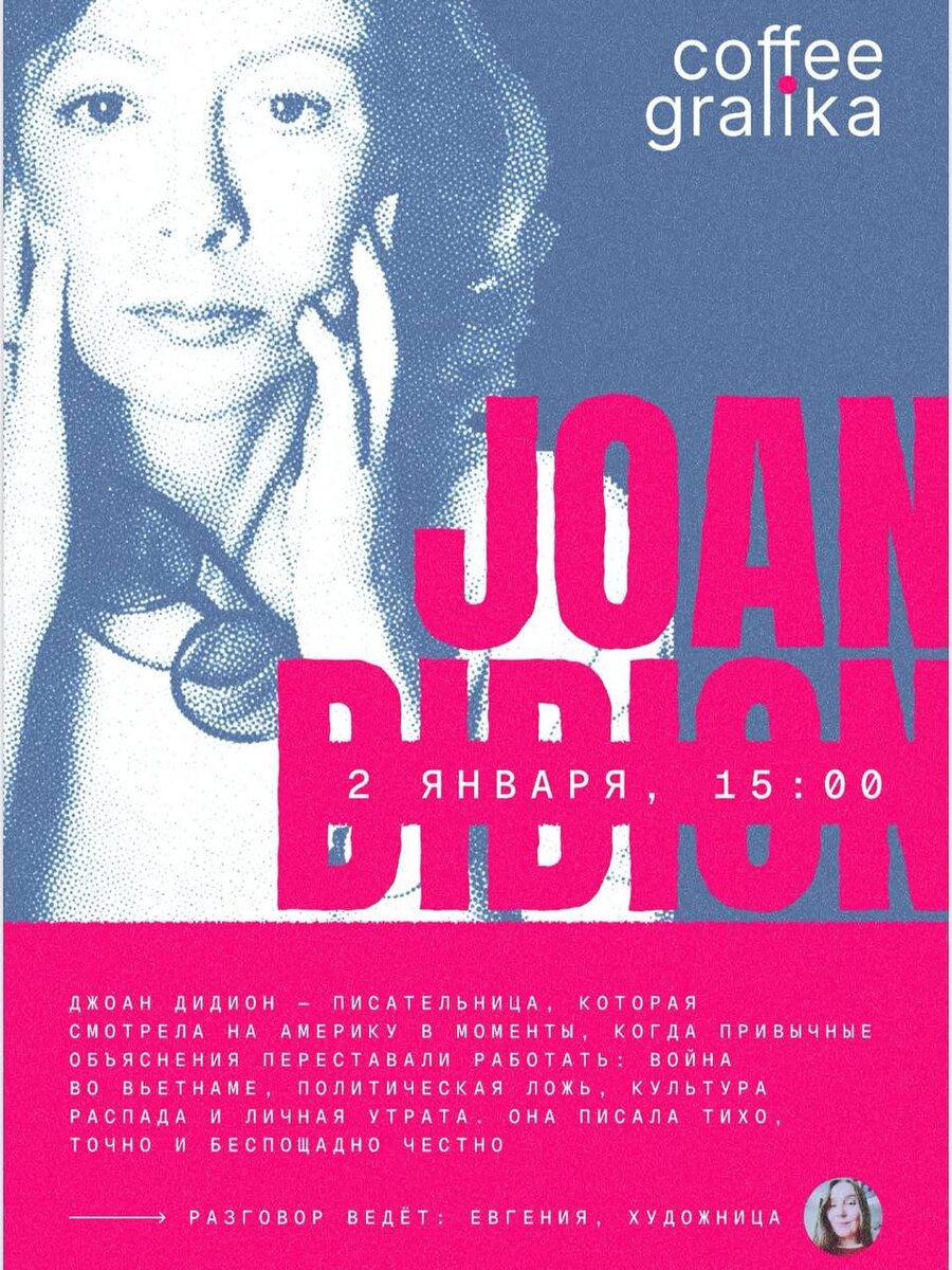 Выбирайте то, что вам хочется. Кстати, в Coffeegrafika 2 января состоится разговор о Джоан Дидион. Писательнице, которая смотрела на мир, когда привычные объяснения переставали работать. Начало в 15:00