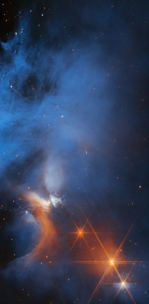 Холодное нитевидное облачное вещество (синее, в центре) светится в инфракрасном диапазоне, освещенное молодой истекающей протозвездой Ced 110 IRS 4 (оранжевое).