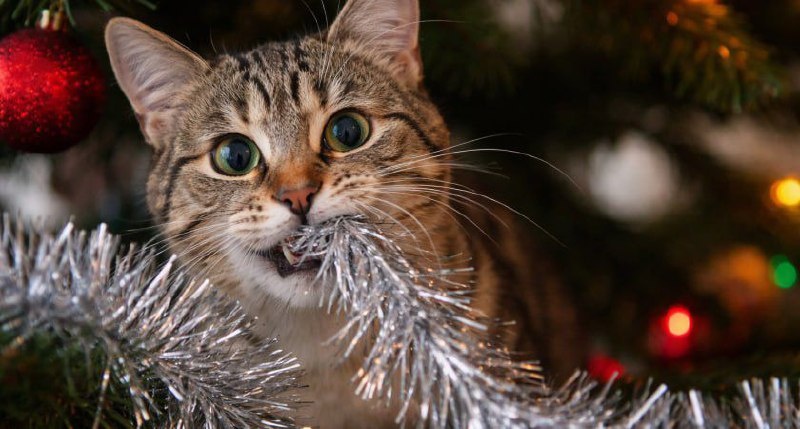 Мишура на елке может стать угрозой для кошек. Они не могут выплюнуть украшение из-за анатомических особенностей языка...