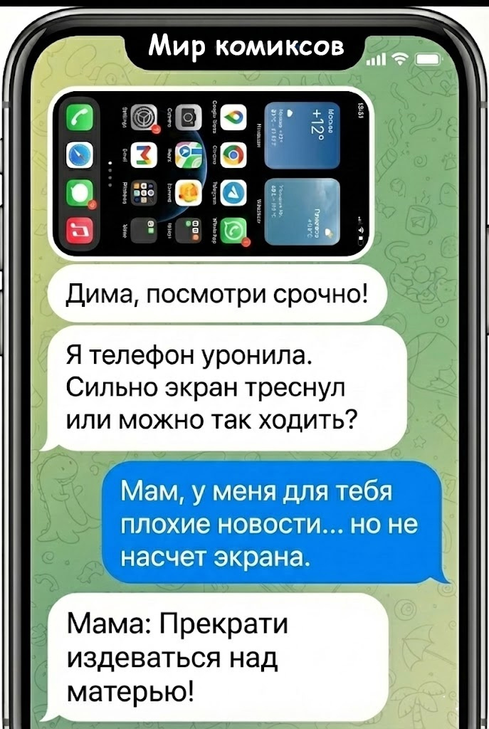 Моей маме уже за 60 и она категорически отказывалась от нового смартфона, предпочитая кнопочный. «Не умею, не хочу, не буду!», — её стандартный ответ. Но наконец-то мне удалось маму уговорить и теперь, казалось бы, можно быть на связи по видео, а еще она сможет смотреть весёлые комиксы. Но мои фантазии разбились о реальность, а смартфон у мамы в руках превратился в ящик Пандоры. Мы с командой поговорили и оказалось, что подобная ситуация у всех. Каждый испытал на себе смесь триллера, комедии положений и инструкции по выживанию в виде переписки с мамой. Поэтому мы собрали для вас классические ситуации, в которых узнает себя каждый, у кого есть мама, смартфон и интернет. Знакомая ситуация? Вы видите индикатор «Мама печатает...». Он висит минуту. Две. Пять. Ваше воображение уже рисует картины: она пишет завещание? Она переписывает «Войну и мир» по памяти? Спорить бесполезно. Ты должен видеть куртку сердцем. А палец — это просто авторский водяной знак, подтверждающий подлинность снимка. У