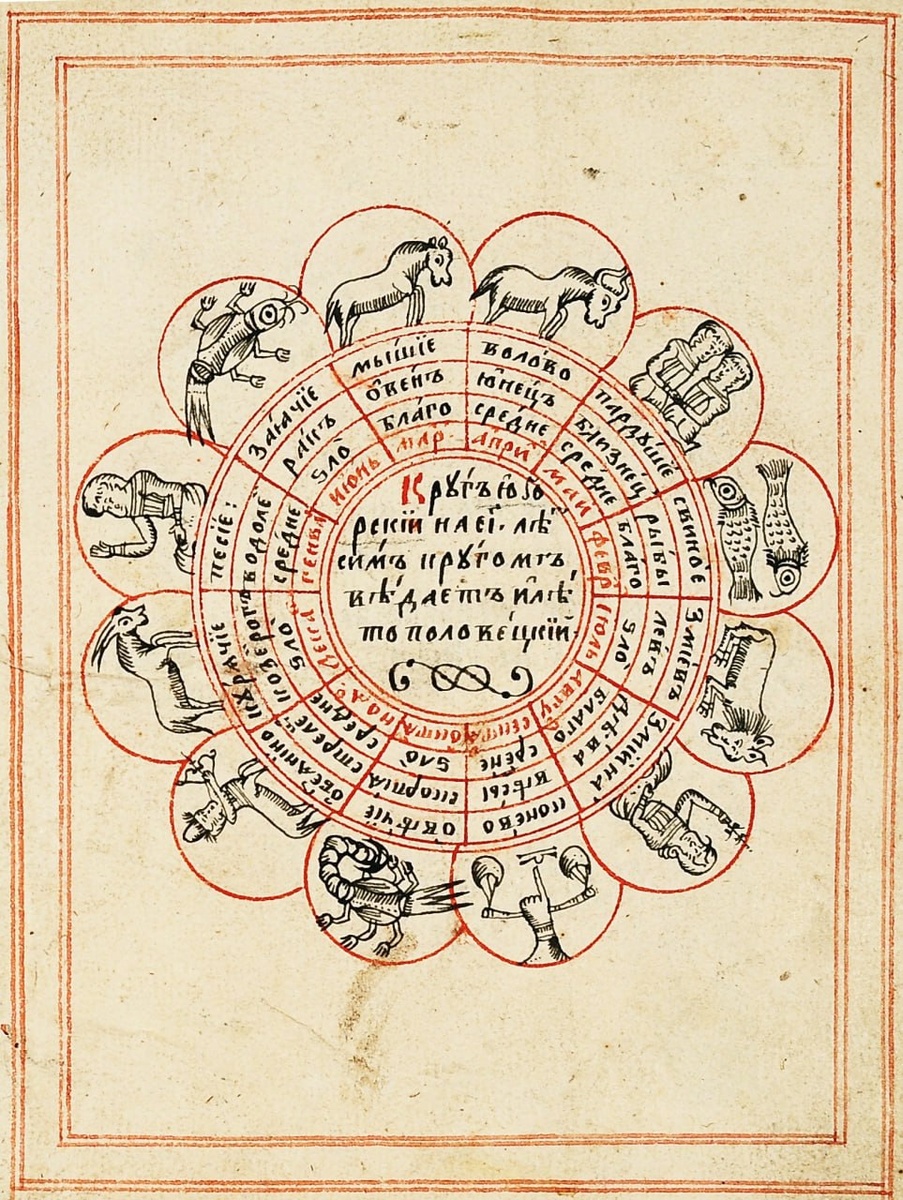 ! Китайский календарь. Сборник календарный, XVII в. В древнерусских рукописях иногда можно встретить китайский календарь - «круг югорский круг». По кругу перечисляются зодиакальные созвездия, месяцы с указанием «благих», «средних» и «злых», а также китайский двенадцатилетний цикл, где упомянуты «курячие», «песие», «заячие», «мышие», что соответствует году петуха, собаки, кролика и крысы.