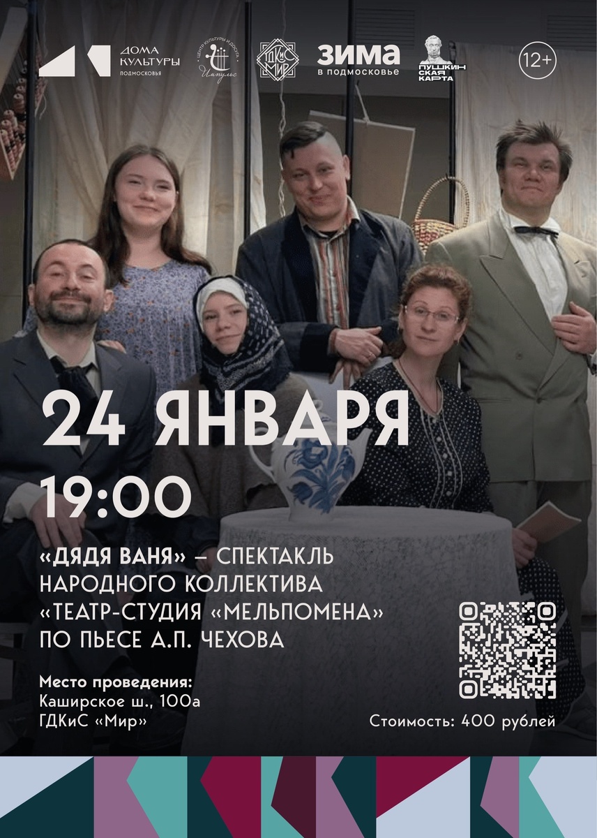 ✨ «Когда нет настоящей жизни - живут миражами», — говорит дядя Ваня. И все герои истово следуют и поклоняются своим миражам и иллюзиям. И главное свойство души — любовь, здесь оборачивается или пошлым фарсом, или демонстративной жертвой, а то и просто сияет неживым, призрачным светом из прошлого. 🚫 Возраст: 12+ 📆 24.01.2026🕒19:00 🏢 Дворец культуры и спорта «Мир» 📍 г. Домодедово, Каширское шоссе, д.100А 💰 Цена: 400 ₽ 🎫 Купить билет: https://iframeab-pre5158.intickets.ru/event/37614376/ ✅ Мероприятия Домодедово https://dzen.ru/id/66f10385cc4c5a16f7b5fb02 http://vk.com/domodedovo_events http://dzen.ru/domodedovo_events
