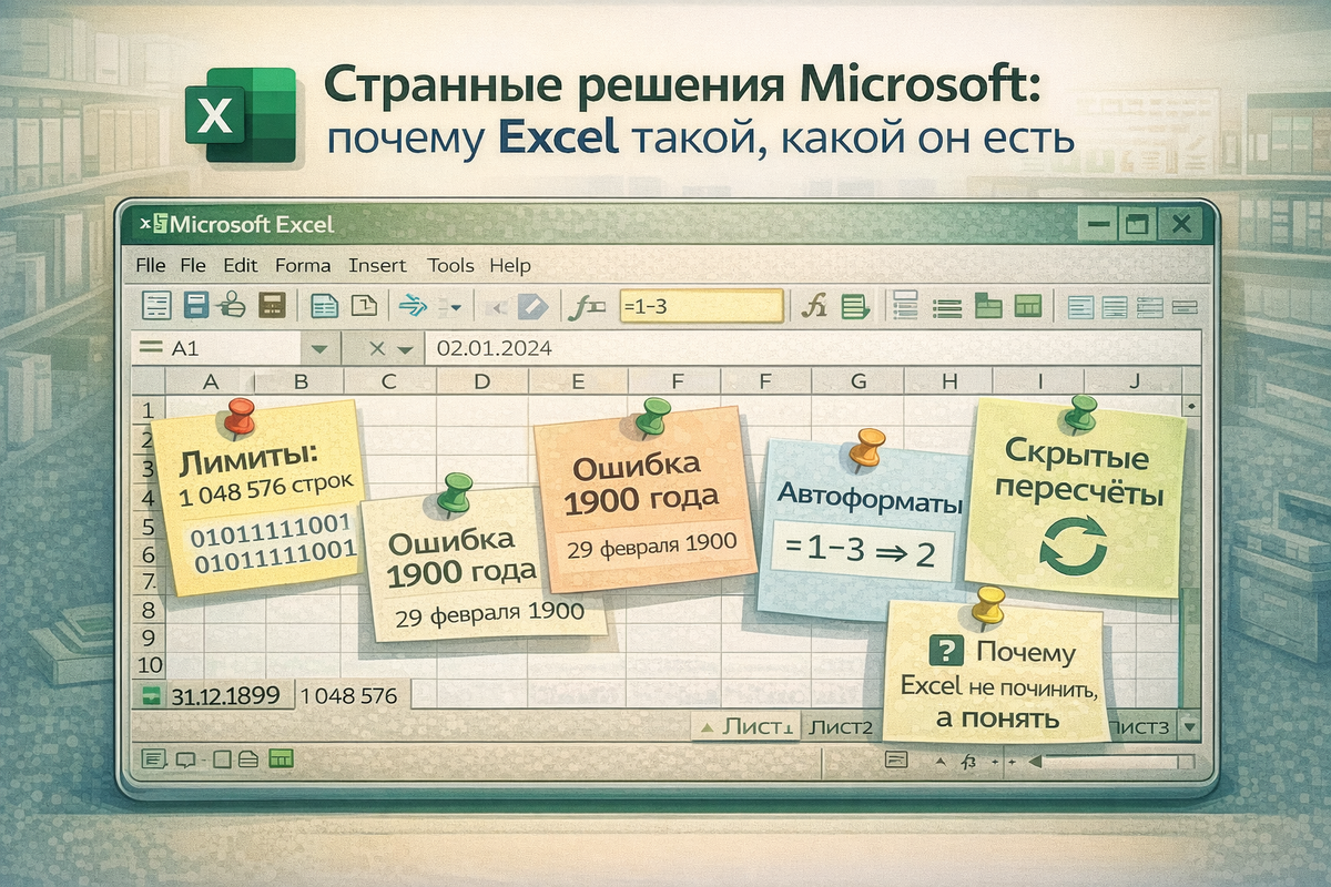 Странные решения Microsoft: почему Excel до сих пор такой, какой он есть. Самые странные и нелогичные решения Excel. Почему Microsoft не спешит их менять и как с этим жить пользователю. Файл: PDF «Мини-каталог странностей Excel» Excel знают все. Но любят его далеко не за всё. Есть вещи, которые раздражают годами. Есть решения, которые выглядят нелогичными. И есть вопросы, на которые Microsoft так и не дала внятного ответа. Excel — продукт с длинной памятью. Каждое новое обновление не переписывает программу с нуля, а аккуратно ложится поверх предыдущих слоёв. В результате Excel — это не цельная конструкция, а археологический слоёный пирог из решений разных эпох. 1 048 576 строк. Почему не миллион? Почему не два? Потому что это 2²⁰. Техническое решение, а не пользовательское. Excel всегда сначала думает как система, а уже потом — как инструмент для человека. Excel до сих пор считает, что 1900 год был високосным. Это ошибка. Но её нельзя исправить — слишком много файлов сломается. Ради со