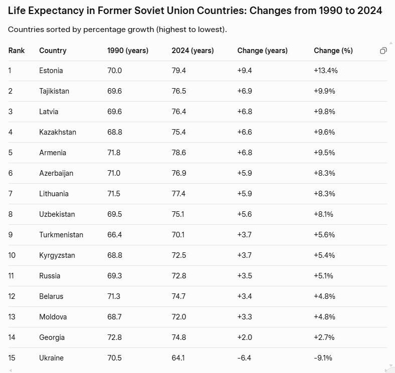 • Рост ОПЖ произошёл везде, кроме (по понятным причинам) Украины, но сам он сильно различался: от +2 лет в Грузии до +9.4 года в Эстонии. Украина и Туркмения — внизу списка, Эстония — безоговорочный лидер, но также можно выделить пару образовавшихся кластеров: • ОПЖ в диапазоне 72.5–75.4, в который входят Казахстан, Узбекистан, Кыргызстан, Грузия, Россия и Беларусь; • ОПЖ в диапазоне 76.4–78.6, в который входят Латвия, Казахстан, Армения, Азербайджан и Литва. • Высокой ОПЖ Казахстана и Таджикистана удивляться не стоит: низкое потребление алкоголя резко снижает мужскую смертность. А в случае Таджикистана также играет роль завышение данных по численности населения, а значит, занижение общего коэффициента смертности (ОКС), а значит, и ОПЖ. Статистика по этой стране не может восприниматься как корректная. (@sterngang)