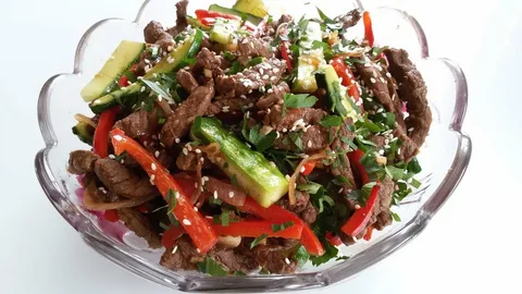Этот салат сочетает в себе насыщенный вкус, яркие цвета и большое разнообразие текстур. Подробно: приготовление, подача, возможные вариации и оценка полезности. Базовый рецепт и приготовление Ингредиенты (на 2-3 порции): · Говядина: 300-400 г (вырезка, филе, тонкий край — часть, которую можно быстро обжарить). · Болгарский перец: 2-3 шт. разного цвета. · Лук репчатый: 1 шт. (лучше красный или белый сладкий). · Чеснок: 2-3 зубчика. · Имбирь свежий: 1 см (по желанию, но очень рекомендуется). · Зеленый лук/кинза/петрушка: для подачи. · Кунжут: для посыпки (белый и/или черный). Для маринада: · Соевый соус: 2 ст.л. · Растительное масло (без запаха): 1 ст.л. · Крахмал кукурузный или картофельный: 1 ч.л. (сделает мясо нежнее). Для заправки: · Соевый соус: 2-3 ст.л. · Уксус (рисовый, винный или сок лайма): 1 ст.л. · Кунжутное масло: 1-2 ч.л. (обязательно! дает азиатский акцент). · Мед или сахар: 1 ч.л. (для баланса). · Перец чили свежий или хлопья: по вкусу. Приготовление: 1. Мясо: Нарежь