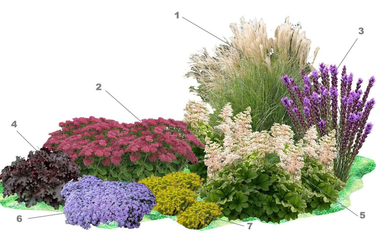 Злаковое декоративное растение с ярко-зелеными листьями. Зацветает в августе-сентябре пушистыми метелками. Очень часто используется в ландшафтных композициях. Есть один минус - сильно разрастается, как все злаковые. Для сдерживания роста можно сделать барьер вокруг куста или посадить в горшок или ведро без дна. 2. Седум (очиток) видный Бриллиант Очиток неприхотливое многолетнее растение, с выращиваем которого справится даже самый начинающий цветовод. Сорт Бриллиант вырастает до 50-60 см в высоту, зацветает в августе соцветиями розово-красного цвета. 3. Лиатрис Многолетний цветок, в высоту достигает 60-100 см. Зацветает в июле пушистыми цветками, собранными в соцветия колосовидной формы. Окрас цветков бывает разным, для сегодняшнего проекта выбирайте сорта с фиолетовыми, сиреневыми или пурпурно-красными цветками. 4. Гейхера Блекберри Джем Декоративное многолетнее растение с ажурными листьями. Несколько раз за лето меняет окраску листьев. Куст в высоту достигает 30 см. Цветет мелкими бел