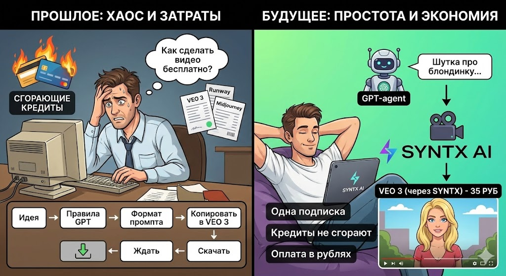 Технологии сейчас развиваются с такой скоростью, что вчерашние прорывы сегодня кажутся громоздкими и неудобными. Если раньше мы тратили часы на подбор идеального промпта, то сейчас наступает эра полной автоматизации. Главный вопрос для любого креатора сегодня - в какой нейросети сделать видео, чтобы это не стоило как крыло самолета и не требовало навыков программиста. Раньше процесс выглядел утомительно: нужно было зайти в одну нейронку, прописать правила для конвертации идеи, дождаться обработки, скопировать результат и нести его в другую модель. Сейчас все эти промежуточные шаги можно просто выжечь. На помощь приходят GPT-агенты - это такие умные помощники, которые сами упаковывают вашу короткую мысль (например, анекдот про блондинку) в сложный технический запрос для генеративной модели вроде VEO 3. Вы просто пишете текст, а агент сам отправляет его в работу и выдает готовый результат. Многие задаются вопросом, как сделать видео в нейросети бесплатно, и сталкиваются с реальностью:
