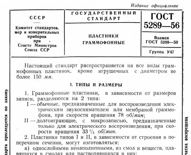 В ситуации, описанной в прошлых главах, ключевым событием отрасли стал выход ГОСТ 5289-56, где пластинки наконец-то впервые официально разделили на “обычные” и “долгоиграющие”. Вот только проблема была в том, что этот ГОСТ по-прежнему носил название “Пластинки граммофонные”, при том, что долгоиграющие пластинки граммофонными по определению не являются, а являются они, если угодно, электрофонными.